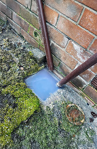 Emergency repairs for blocked downpipes and roof drainage systems causing water to overflow, potentially damaging ceilings and internal structures.